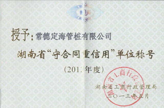 經湖南省工商行政管理局在湖南日報(2013年5月24日)第10版公示,公司及常德市77家單位獲得2012年度守合同重信用單位。